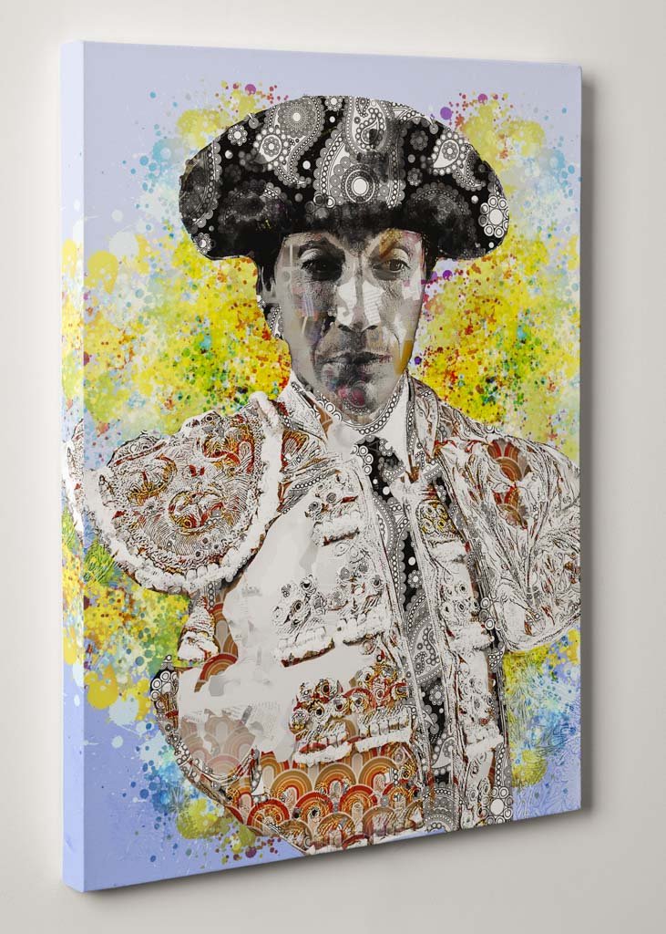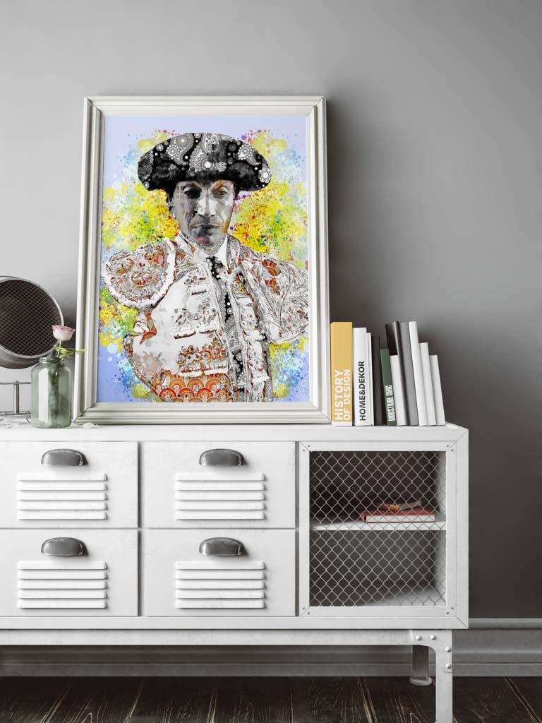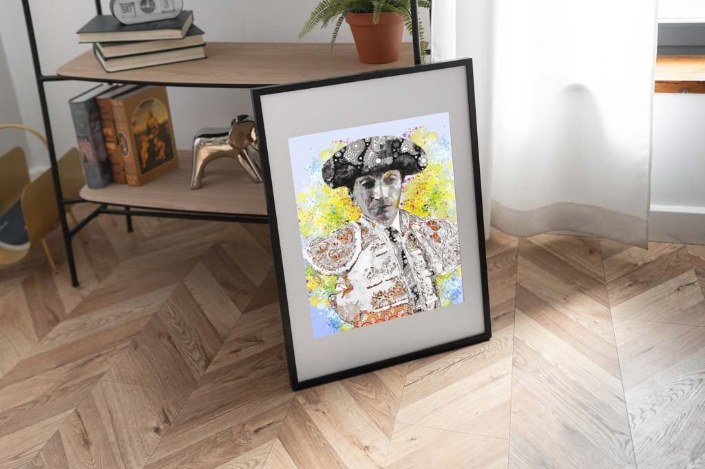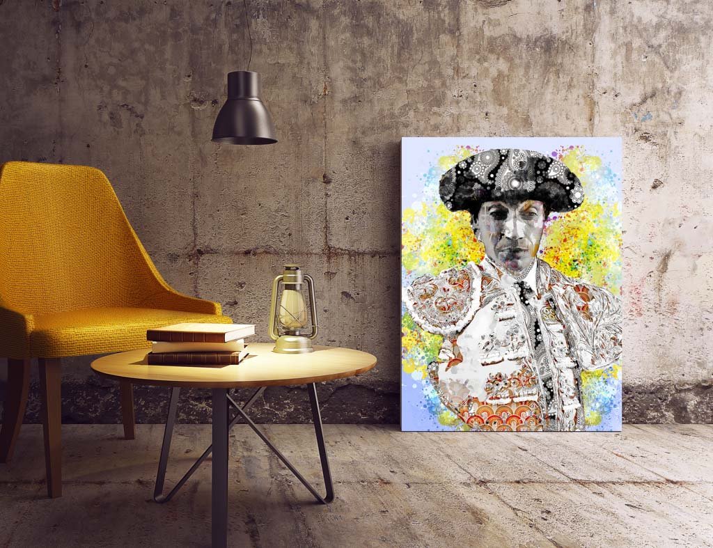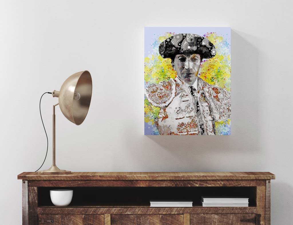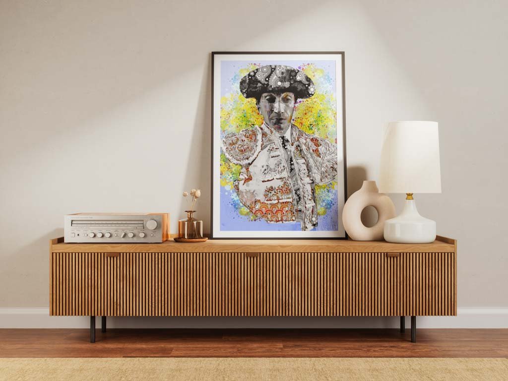 Esta obra es ideal para espacios que busquen un equilibrio entre lo clásico y lo contemporáneo. Un salón de inspiración ecléctica o un despacho artístico con paredes en tonos neutros potenciará la explosión de color y la intensidad visual del fondo, mientras que la figura imponente de Curro Díaz se convierte en el punto focal del ambiente.