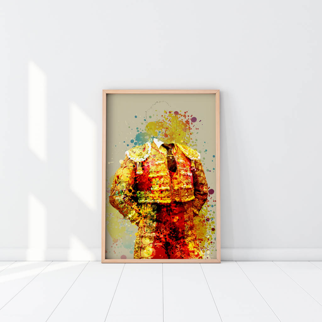Este cuadro taurino contemporáneo es ideal para interiores que buscan un toque sofisticado y vibrante. En un salón de estilo minimalista o en una estancia con decoración industrial, su impacto cromático transforma la atmósfera, aportando personalidad y carácter. Bajo una iluminación cálida, cada detalle del traje y cada mancha de color cobran vida, convirtiendo la obra en un punto focal que no pasa desapercibido.