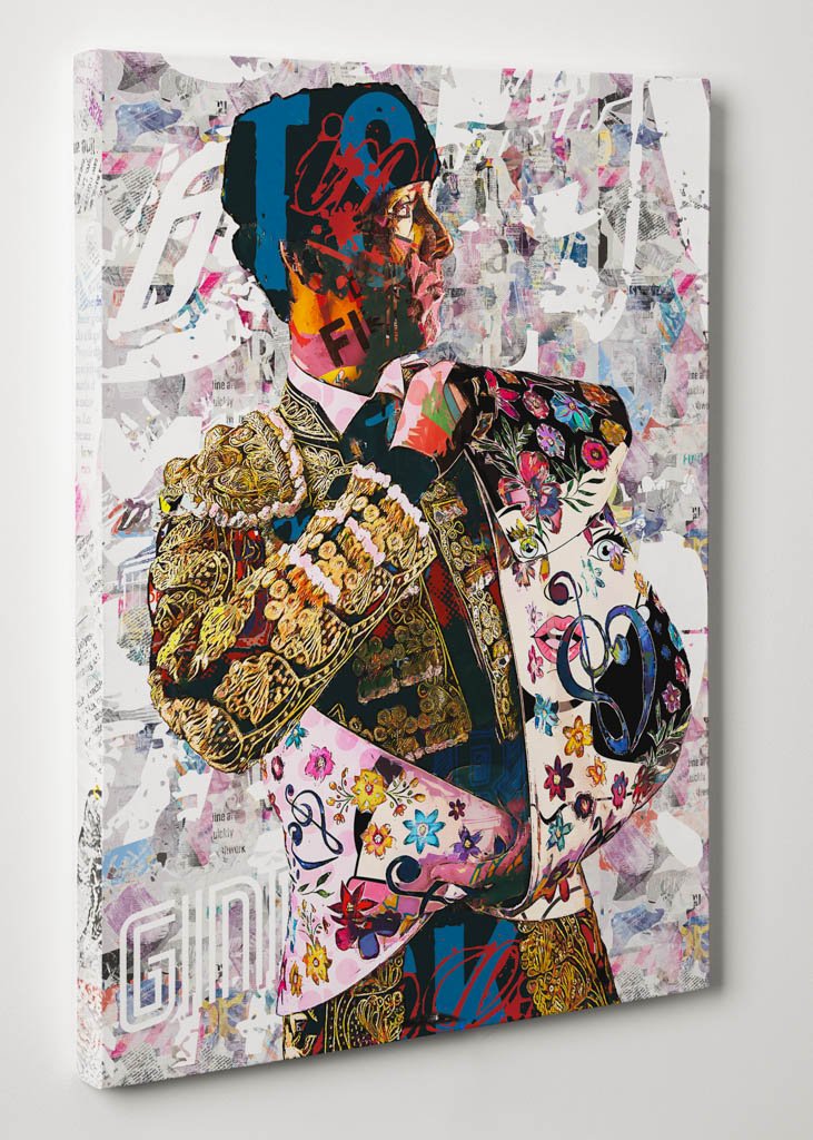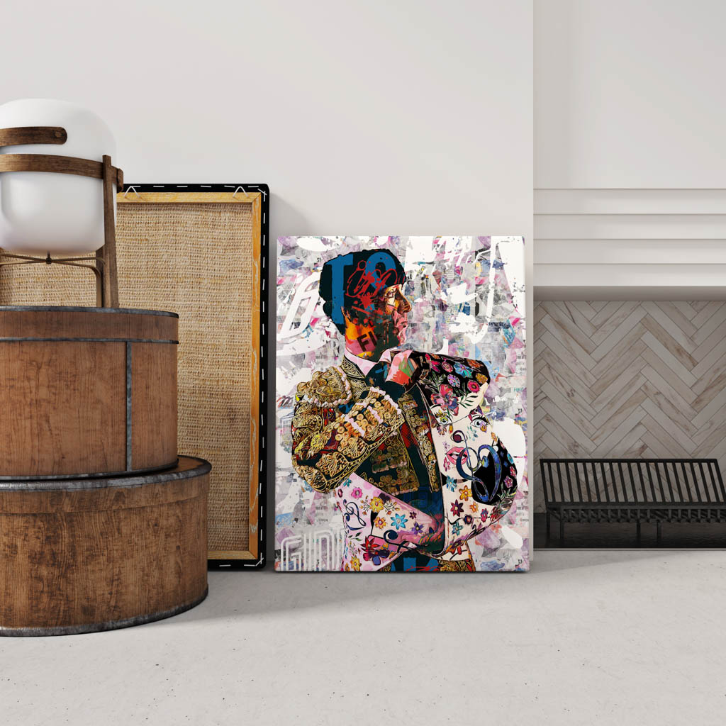 El cuadro torero Esaú Fernández nos presenta a una de las figuras jóvenes de la tauromaquia sevillana, representado en una pose cargada de energía y solemnidad. Su expresión concentrada, unida a la firmeza de su porte, transmite la pasión y el compromiso que definen su trayectoria. Esta obra se enmarca dentro de los cuadros modernos taurinos, fusionando la tradición del traje de luces con un lenguaje visual contemporáneo y vibrante.