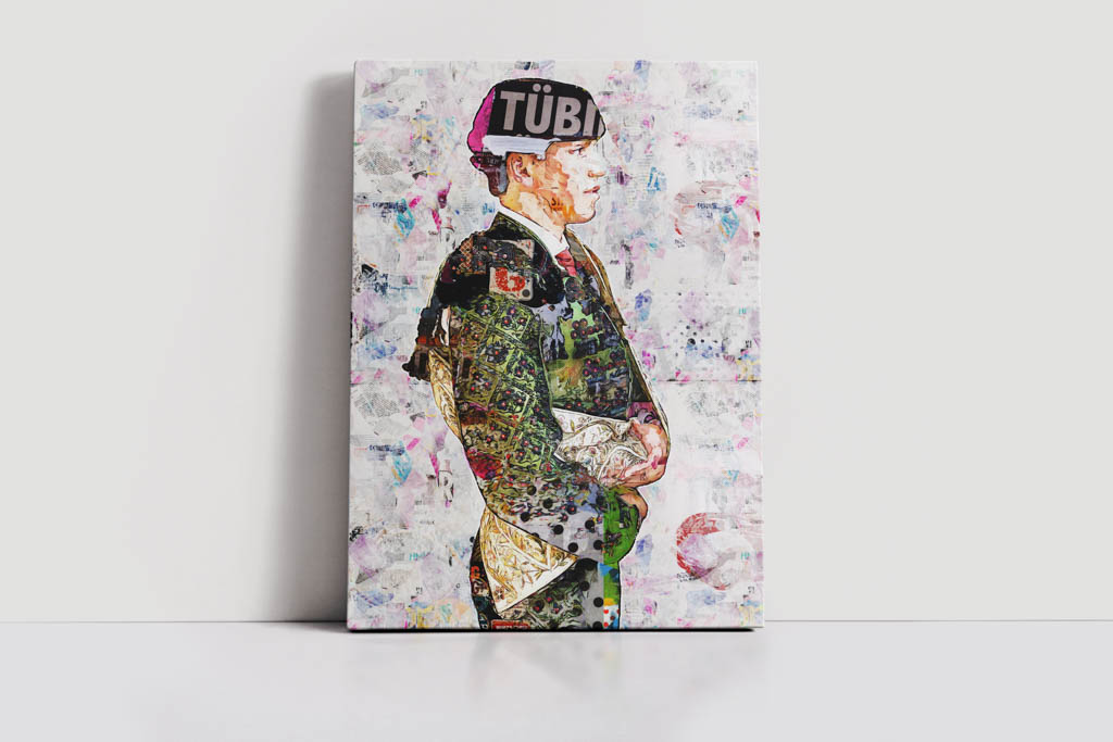 El fondo de la obra, elaborado con recortes de periódicos, tipografías y colores superpuestos, refleja el murmullo constante que rodea a la tauromaquia. Esta atmósfera de palabras y texturas sitúa a Zulueta en el centro de la atención mediática y popular, como una promesa que empieza a escribirse en las crónicas taurinas.