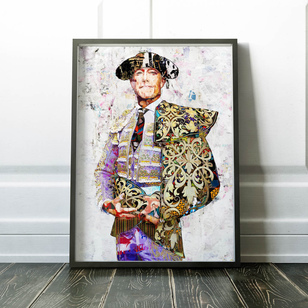 Este cuadro está concebido para convertirse en una pieza central en cualquier espacio. En un salón moderno, con paredes neutras que permitan destacar la viveza de los tonos dorados y violetas, o en un rincón dedicado al arte, la obra aporta fuerza, carácter y solemnidad. La presencia de Manuel Escribano trasciende lo decorativo: invita a la reflexión sobre la valentía, la tradición y el legado de un torero que ha sabido dejar huella en la historia reciente de la tauromaquia.