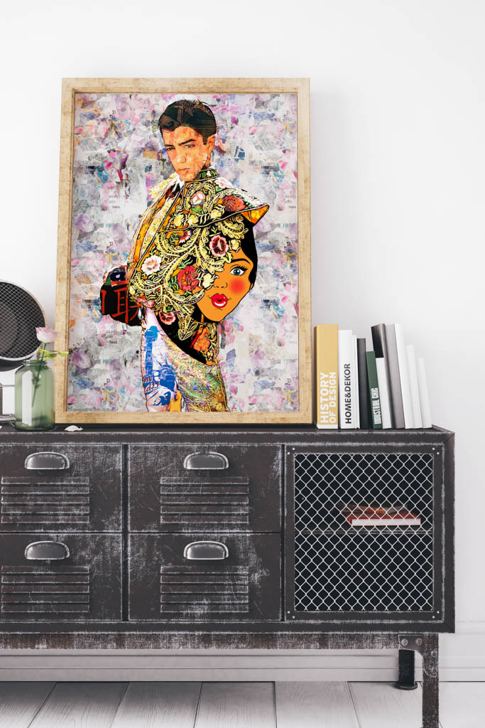 El fondo, construido mediante una técnica de collage con recortes de periódicos, tipografías y texturas superpuestas, genera una atmósfera dinámica que representa el murmullo constante de la crítica, la expectación del público y la memoria de la prensa taurina. Entre ese caos controlado, Marco Pérez emerge como figura sólida y luminosa, símbolo de la continuidad y renovación del arte taurino.
