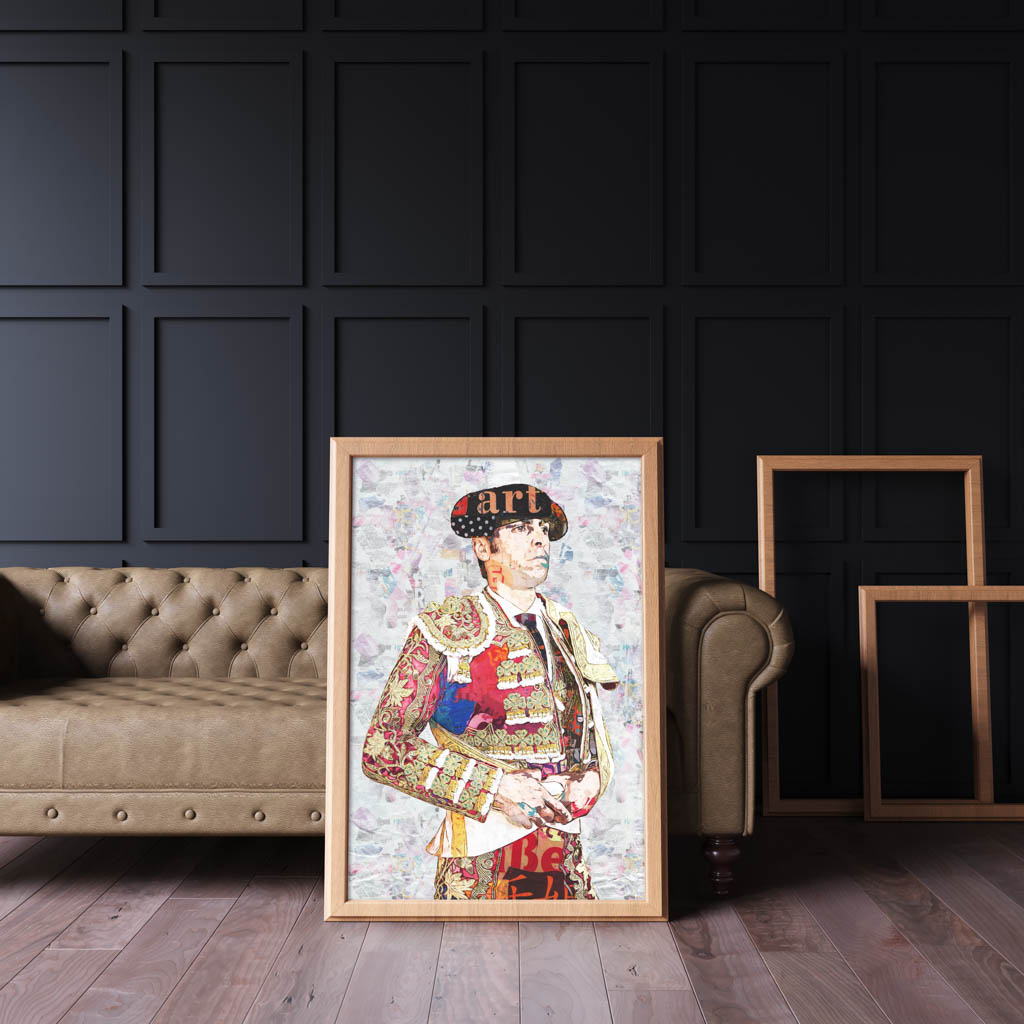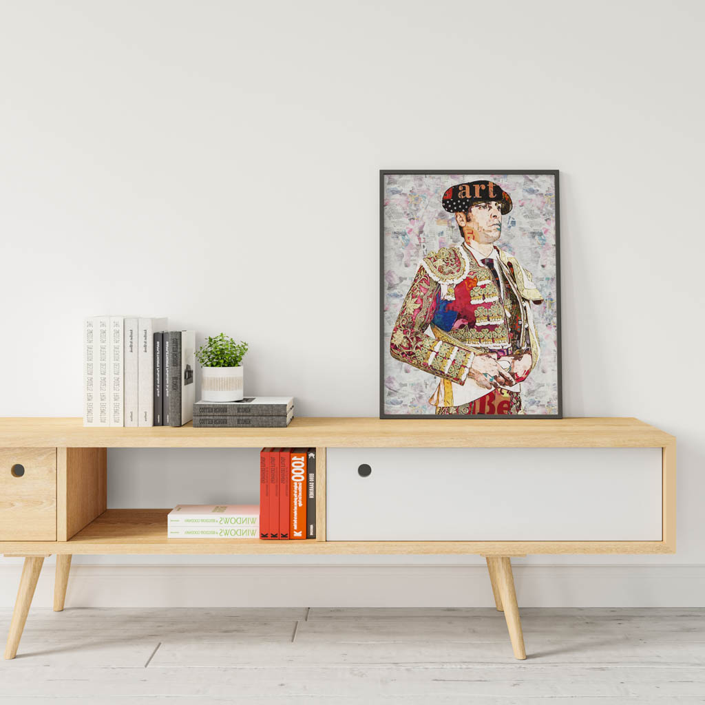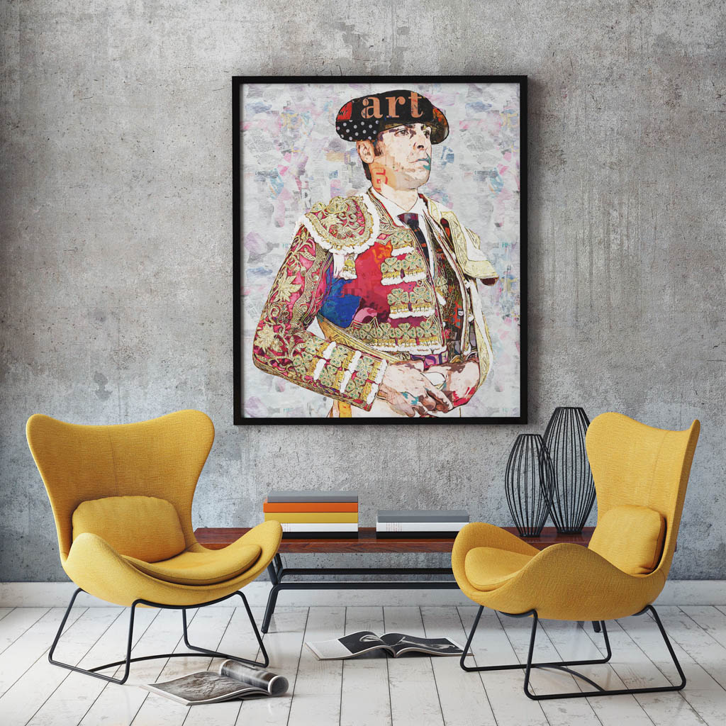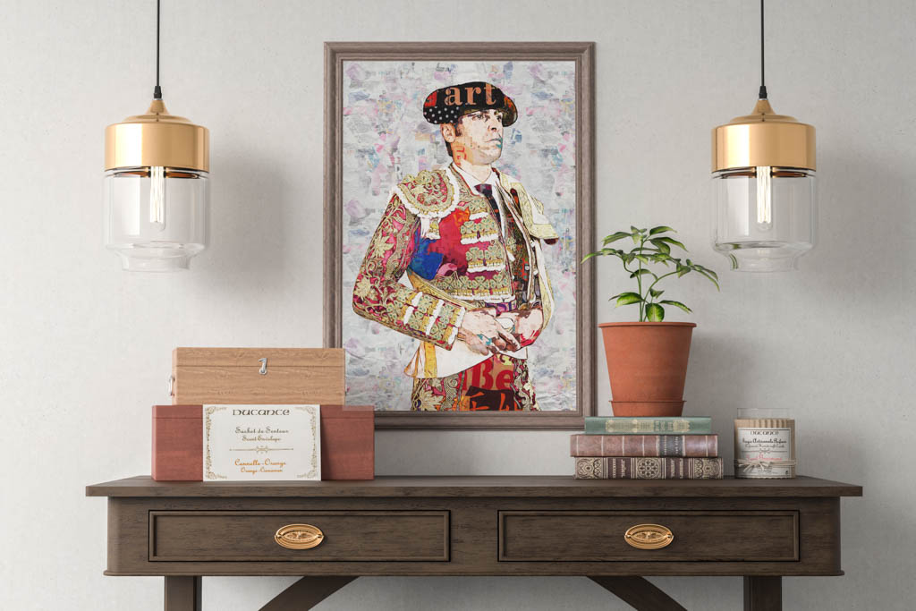 Ideal para un ambiente amplio y moderno, esta obra se destaca en salones minimalistas o estudios con iluminación suave que resalta cada detalle del collage y los destellos del traje. En espacios con paredes en tonos neutros, la figura de Miguel Ángel Perera se erige como el centro de atención, invitando a la contemplación y a la admiración de la belleza del toreo.