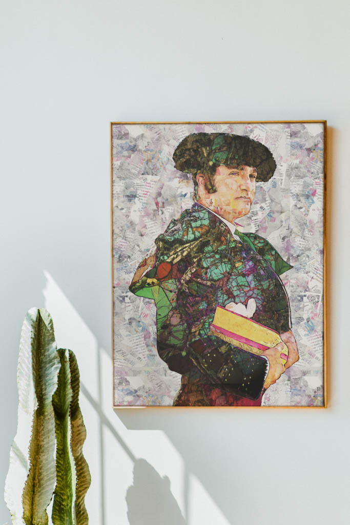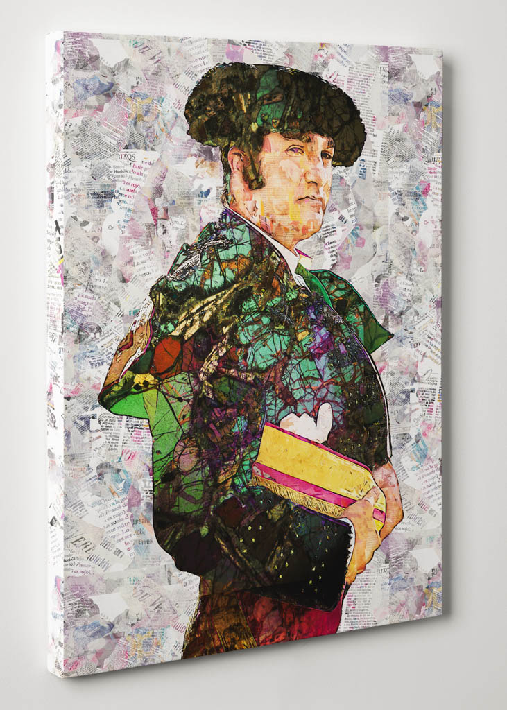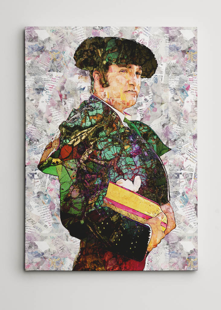 Esta serie de obras dedicadas a Morante de la Puebla capta la esencia de uno de los toreros más carismáticos y personales de la tauromaquia contemporánea. En cada cuadro, su silueta imponente se alza sobre un fondo de collages caóticos y llenos de color, donde fragmentos tipográficos, trazos abstractos y elementos modernos se mezclan con la tradición del traje de luces. El resultado es una colección que no solo rinde homenaje al torero, sino que también lo eleva como símbolo del arte taurino en su vertiente más creativa y contemporánea.