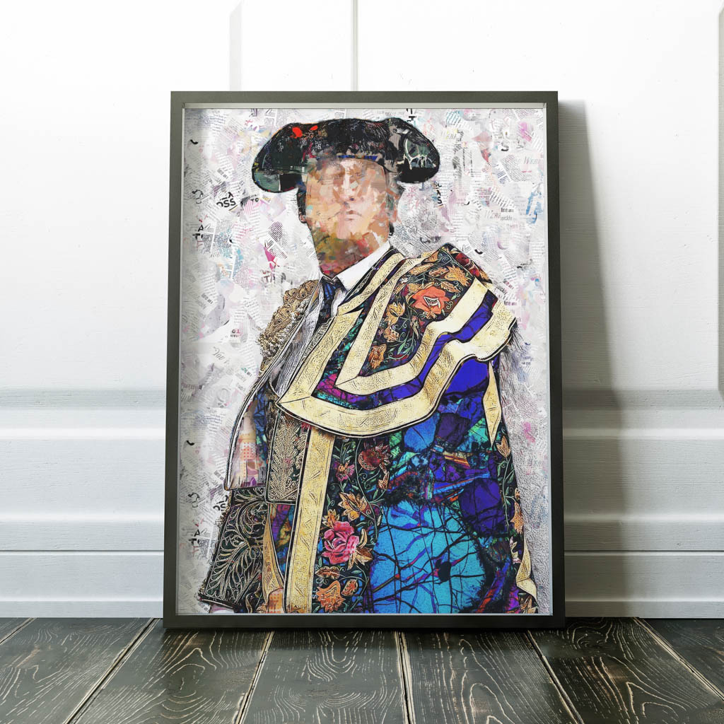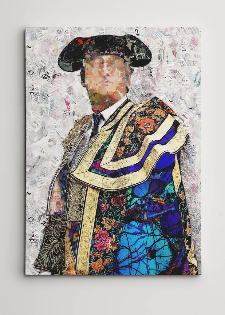 Esta serie de obras dedicadas a Morante de la Puebla capta la esencia de uno de los toreros más carismáticos y personales de la tauromaquia contemporánea. En cada cuadro, su silueta imponente se alza sobre un fondo de collages caóticos y llenos de color, donde fragmentos tipográficos, trazos abstractos y elementos modernos se mezclan con la tradición del traje de luces. El resultado es una colección que no solo rinde homenaje al torero, sino que también lo eleva como símbolo del arte taurino en su vertiente más creativa y contemporánea.
