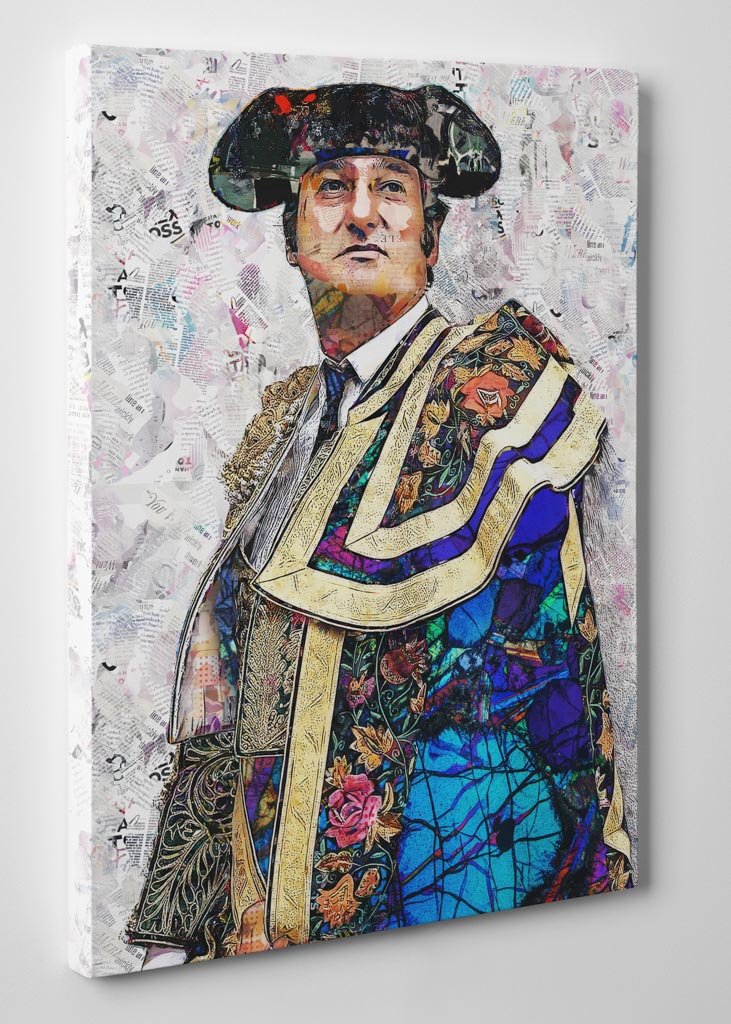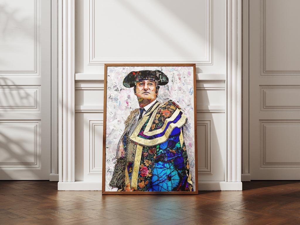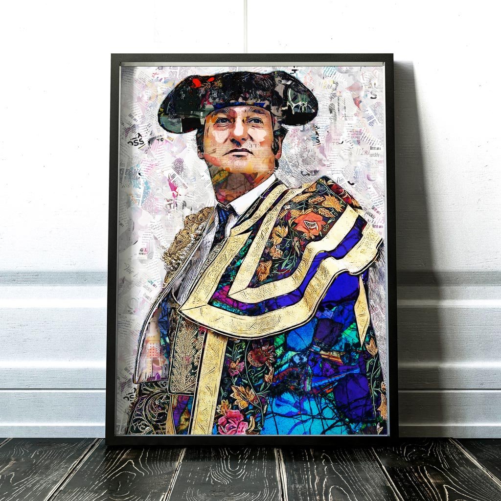 Esta serie de obras dedicadas a Morante de la Puebla capta la esencia de uno de los toreros más carismáticos y personales de la tauromaquia contemporánea. En cada cuadro, su silueta imponente se alza sobre un fondo de collages caóticos y llenos de color, donde fragmentos tipográficos, trazos abstractos y elementos modernos se mezclan con la tradición del traje de luces. El resultado es una colección que no solo rinde homenaje al torero, sino que también lo eleva como símbolo del arte taurino en su vertiente más creativa y contemporánea.
