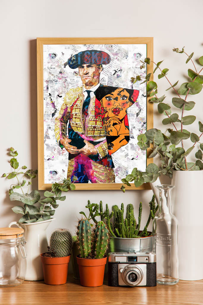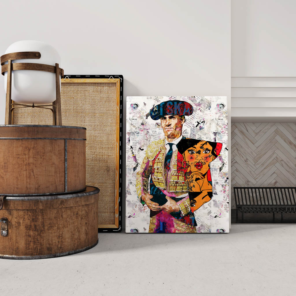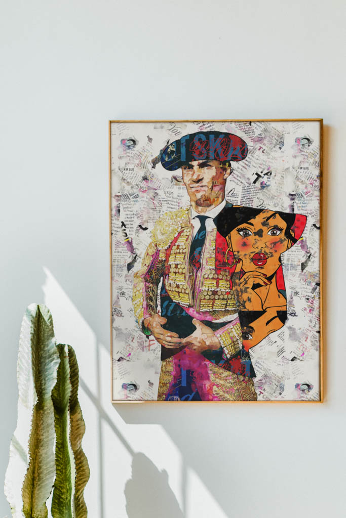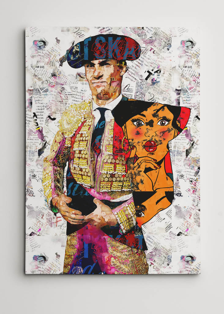 El traje de luces, trabajado en tonos dorados y rojizos, resplandece con una intensidad especial bajo la textura del collage. Los detalles de los bordados, casi táctiles, invitan a perderse en cada filigrana, mientras que los contrastes cromáticos recuerdan la fuerza simbólica de la tauromaquia: la pasión, la tradición y la fugacidad del instante. Cada hilo parece dialogar con el caos del fondo, subrayando que la belleza del toreo reside precisamente en esa tensión entre lo efímero y lo eterno.