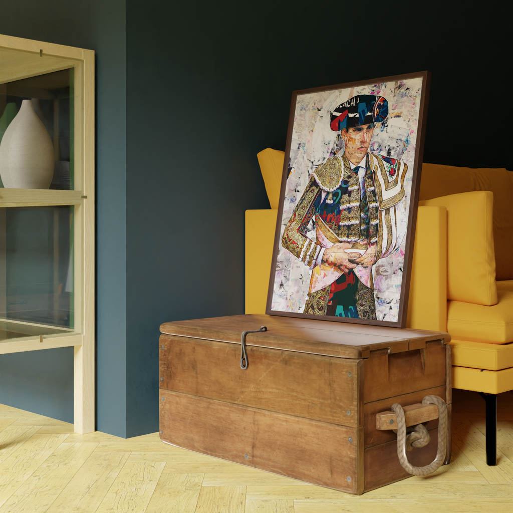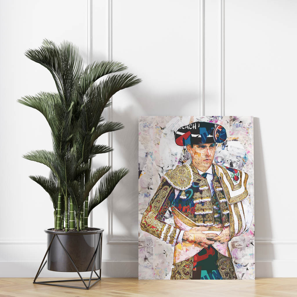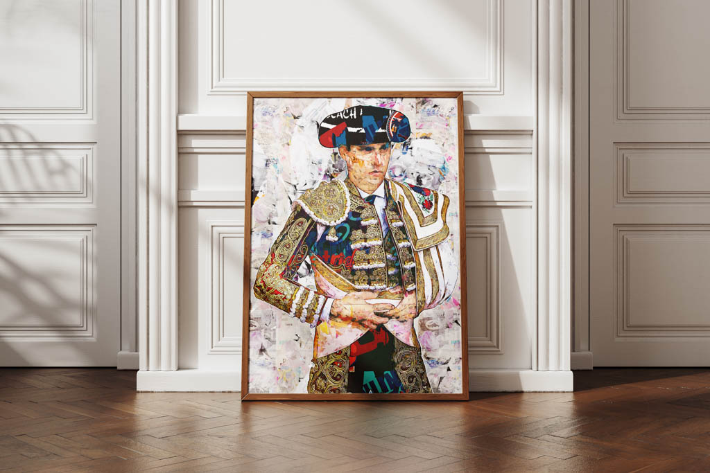 El retrato de Rubén Pinar trasciende la mera representación para convertirse en un puente entre pasado y presente. La fuerza de su pose y la riqueza de su traje dialogan con los elementos contemporáneos del collage, creando una pieza que mezcla la tradición taurina con el lenguaje visual actual. Es un cuadro que rinde homenaje al valor del torero y, al mismo tiempo, aporta frescura a la iconografía clásica de la tauromaquia.