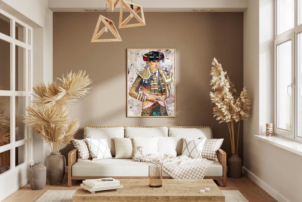 Este cuadro moderno taurino de Rubén Pinar es perfecto para un salón, un despacho o una estancia donde se quiera proyectar fuerza y autenticidad. Sobre paredes neutras y bajo una iluminación suave, los dorados del traje y los contrastes del fondo cobran todo su esplendor, convirtiéndose en el alma del espacio. Más que una pieza decorativa, es una declaración de respeto al arte taurino y al temple de un matador que representa la continuidad de una tradición centenaria.