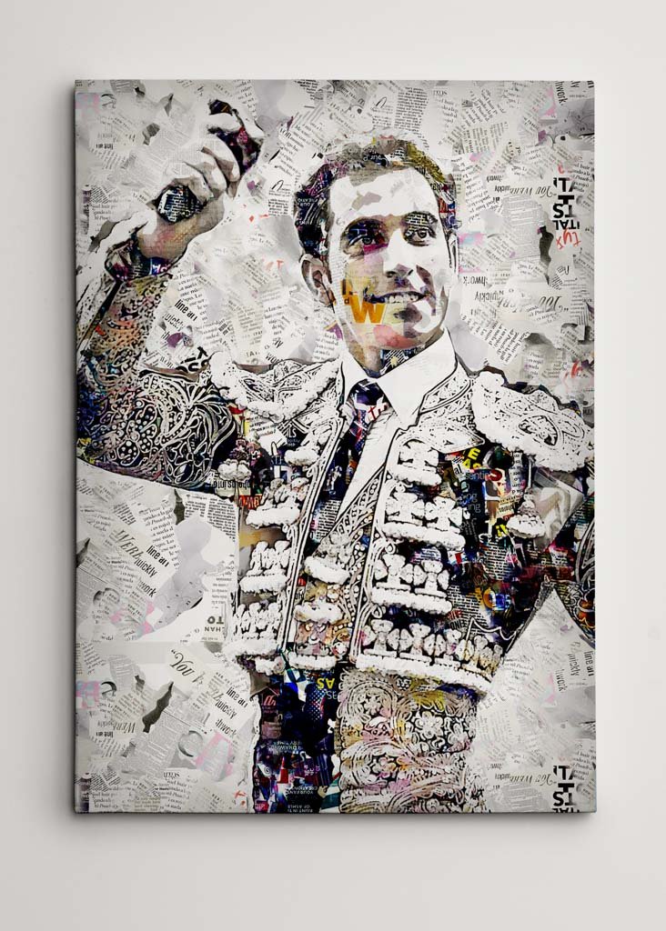 El fondo, elaborado con recortes de periódicos, actúa como un eco de la atención que siempre rodea a cada faena. Fragmentos de palabras y crónicas giran alrededor de Salvador Cortés, como si el aire mismo estuviera impregnado de historias y aplausos, cristalizando la atmósfera vibrante de la plaza. Esta mezcla de textos y recortes crea el escenario perfecto para resaltar la figura del torero, quien emerge con claridad y fuerza en medio de una marea de recuerdos impresos.