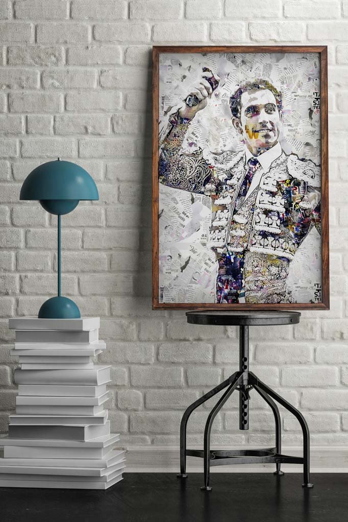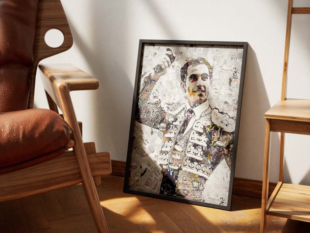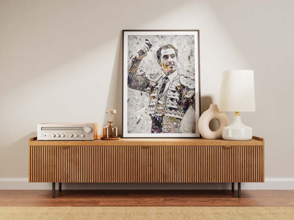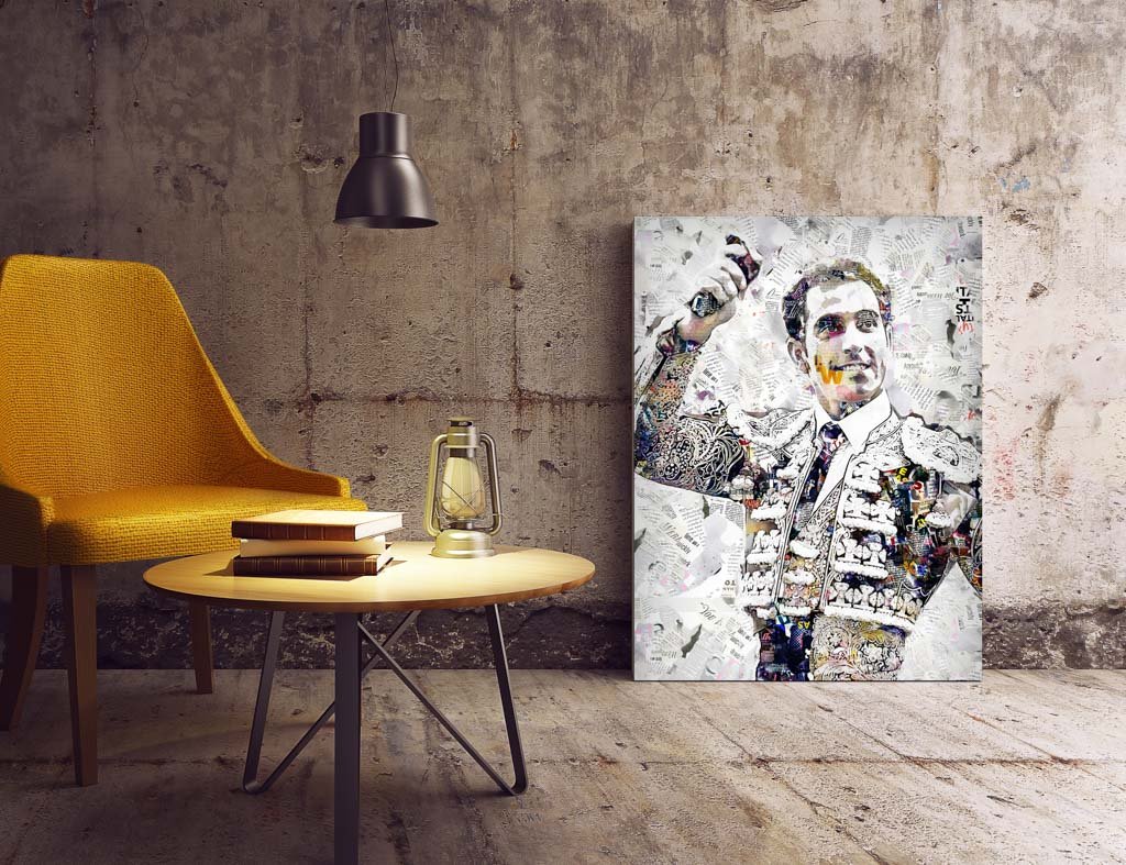 Este cuadro trasciende el mero tributo a un torero; es una celebración del instante de gloria y un testimonio visual del arte y la emoción que se respiran en la plaza. Colocado en un espacio moderno, rodeado de muebles de líneas limpias y una decoración que no compita con la intensidad de la obra, este retrato se convierte en el alma del lugar, capturando la mirada e interés de todos los que se detienen ante él.