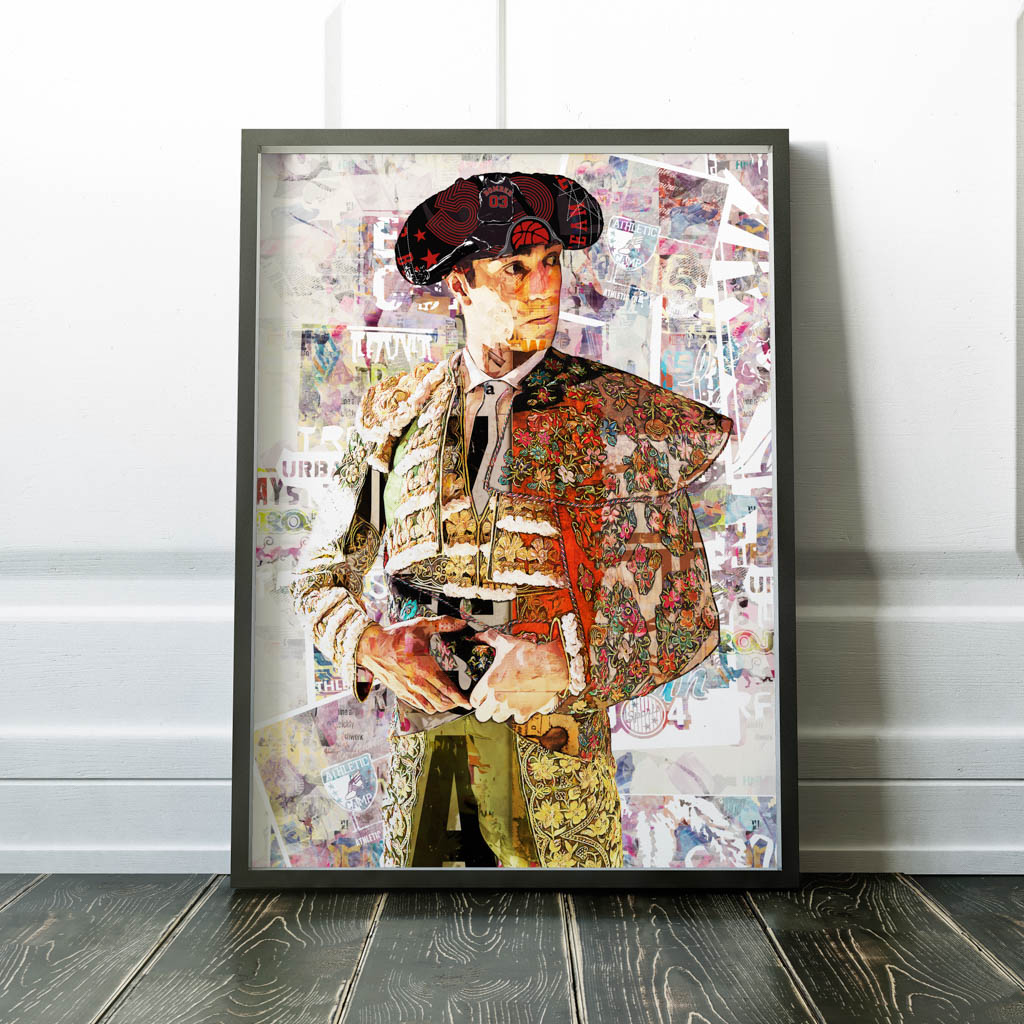 Este cuadro torero Tomás Rufo recoge la esencia de uno de los jóvenes valores más destacados de la tauromaquia actual. Su porte erguido, la mirada firme y la serenidad de su gesto transmiten la seguridad de quien pisa el ruedo con respeto y decisión. La obra es un homenaje al presente y al futuro del toreo, un retrato que combina la fuerza de la juventud con la elegancia clásica de la tradición.