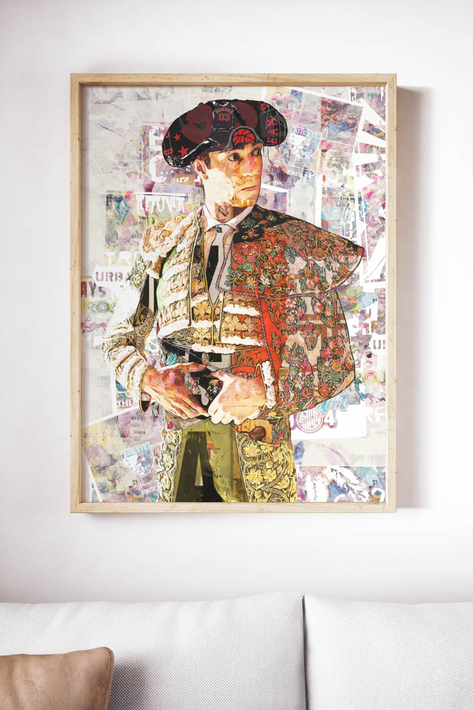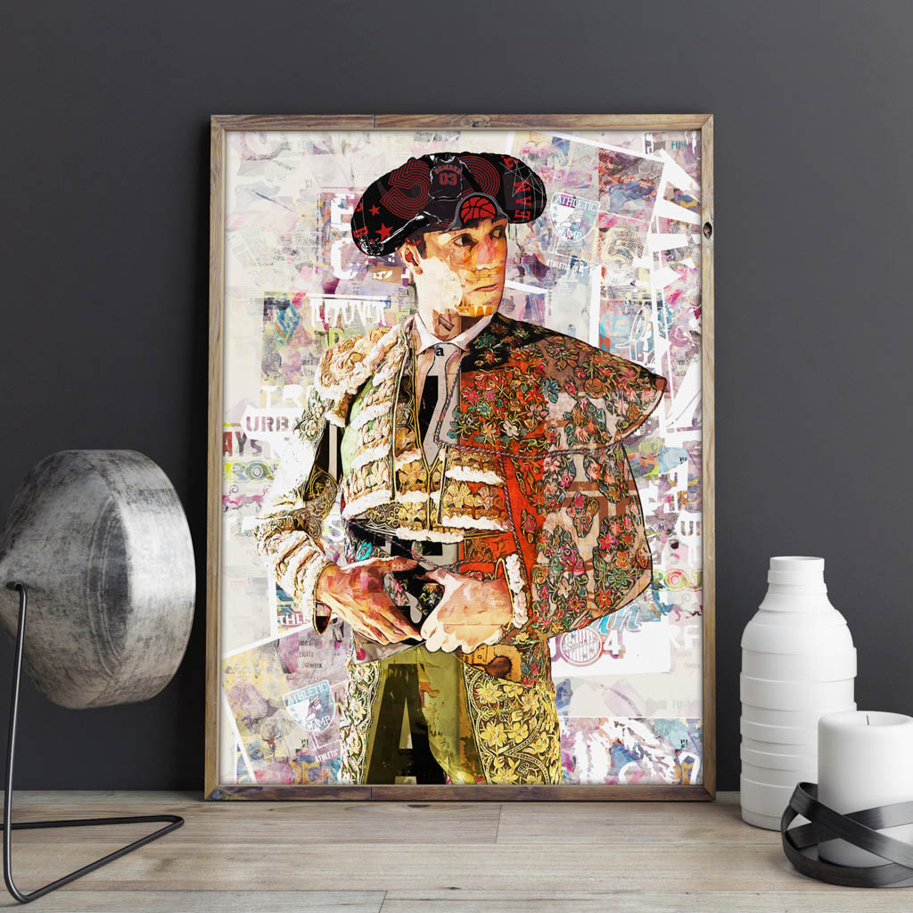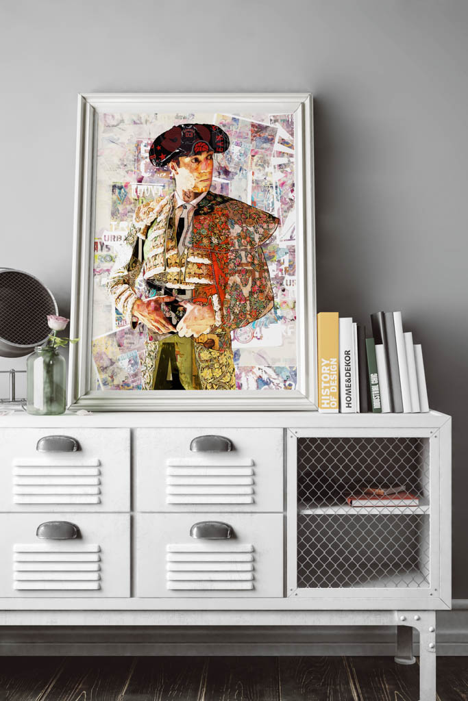 Este cuadro no solo rinde tributo al torero, también aporta una fuerte carga estética a cualquier espacio. En un entorno moderno, de líneas limpias y decoración minimalista, se convierte en un punto focal que transmite energía y carácter. Su paleta cromática rica en dorados, verdes y rojos dota al ambiente de un aire vibrante, mientras la postura confiada de Rufo aporta serenidad y equilibrio visual.